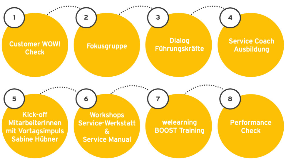 Bei der Umsetzung setzen wir auf Multiplikatoren und Service Coaches. Als Botschafter für konsequente Kundenorientierung begleiten sie Mitarbeitende auf allen Ebenen. Sie gehen als Pioniere voran, räumen Steine aus dem Weg, nehmen mögliche Ängste, feiern Erfolge und machen vor allem Lust auf Kundenspirit! Sie zeigen, dass echte Kundenorientierung vor allem eine neue Haltung bedeutet. Und das alles im Tandem mit den Führungskräften, die auch eine tragende Rolle spielen.